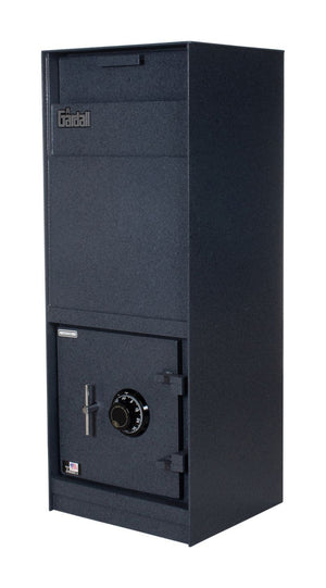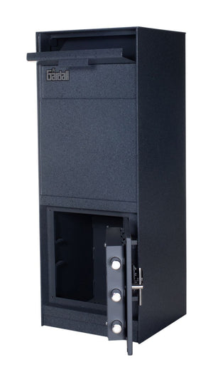 The Gardall FL1337SD B-Rated Depository Safe is a single door, single compartment depository safe with the same amount of interior storage space as a dual compartment depository safe. It comes with the option of having either a combination lock, key lock, or a digital electronic lock. This safe features a 1/2" steel door with punch resistant bolt and has 3 live locking door bolts to deter forcible entry. The FL1337SD uses a front loading drop door for depositing items. Operation is easy, simply pull drop door forward, place items to be deposited inside, and then release the drop door. The contents will fall into the compartment inside the safe.