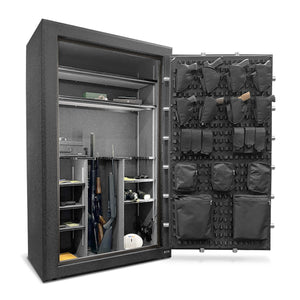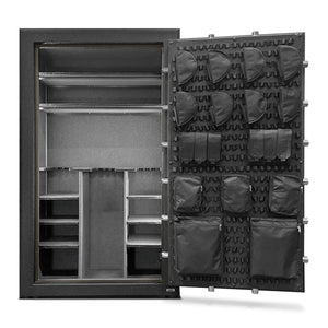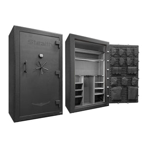 The outside of the Stealth Premier 50 Gun Safe is painted an extremely durable armored black finish that looks great in any location. The handle is a black, 5-spoke handle. The edges are beveled to give it a great look. Inside is a gray fabric interior with leather-line shelves. The interior is customizable by allowing you to move the shelves up or down or remove them completely. There are two reinforced adjustable top shelves, three adjustable side shelves, and a dual gun rack.
