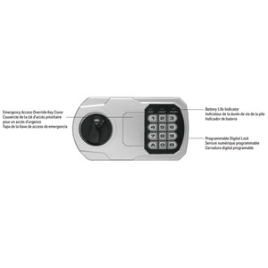 The lock on the Honeywell 5110 Small Security Safe is a digital keypad that can be programmed with your own custom combination. There is also an emergency override key access (2 keys included) in case the battery dies, you forget your combination or something happens to the lock. The hinges are pry resistant and concealed plus the door is recessed to prevent pry attacks. Inside is a carpeted floor mat to protect your items and handgun. A 5 year limited warranty is also included with the 5110.