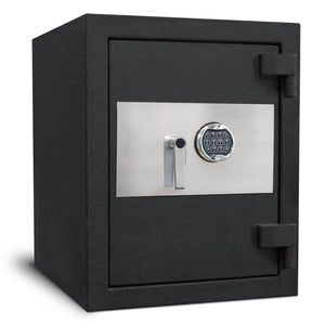 The door is locked on the Stealth CS25 Concrete Composite Burglar Fire Safe with 6 solid steel chrome plated 1-1/4" locking bolts. Three of them are active and three are deadbolts on the hinge side. This makes the door difficult to pry open. The door is also secured by a UL Type 1 high security NL digital electronic lock which is one of the most reliable locks in the industry today. The lock is backed by Stealth's 2-year factory warranty. Stealth includes an internal hardplate and relocker behind that lock that adds an extra level of security to prevent drill attempts to the door.