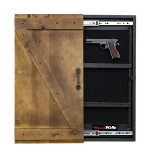 CLICK HERE to watch our video on “What to Do When Your Safe Arrives.”Do you like the rustic look of a barn door? Why not hide your handguns and valuables behind the look of a nice looking vault door. The Tactical Walls Mini Barn Door Concealment features a magnetic lock to open. It comes with 2 large retention magnets. It is wall surface mounted so there is no need to cut a hole in your wall. It will just mount directly to the wall.