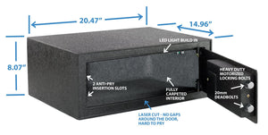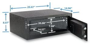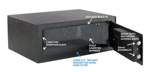 Some of the great features of the Viking VS-38BLX Laptop Biometric Fingerprint Safe is it’s advanced optical sensor, numeric digital keypad and LCD display. It can store up to 32 unique fingerprints and 1 pin code. The safe is made with laser cut steel and is pry-resistant with a seamless weld and a military scratch resistant finish. The locking deadbolts are motorized and reinforced by two anti-pry insertion slots for added security. The biometric lock also has a sound off/on warning beep if the door is left unlocked for more than 1 minute and a timeout period if 5 incorrect pin numbers or 10 fingerprint attempts are made. There are 4 pre-drilled mounting holes to keep the safe securely anchored down. The interior is fully lined and has an LED light to help you see your items in dimly lit locations.