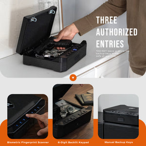 Access your firearms and valuables instantly with three convenient unlocking options: an upgraded biometric fingerprint scanner, a 6-digit backlit touchpad, and two manual backup keys. The automatic door opening system ensures you can grab your firearm in seconds.