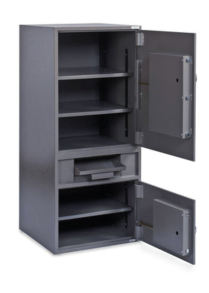 Having a place to lock up your cash drawers separate from your deposits is beneficial to your business. Many times you either have to buy two safes or have one large safe that has the cash trays and deposits in one compartment. The SafeandVaultStore F-4620DDEE B-Rated Cash Management Depository Safe allows you to store your cash trays in the top compartment behind a locked door, and your deposits are locked securely in the bottom compartment. This way you can limit your exposure in the event of an armed robbery and limit internal employee theft as well.