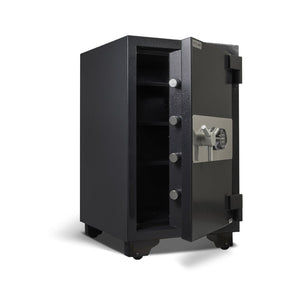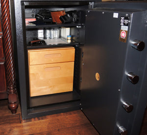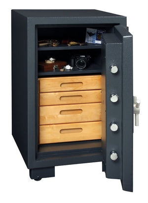 Three powder-coated, adjustable shelves are included. In addition, users have the option of purchasing a fourth shelf or customized drawer safe cabinets, to help organize valuables.