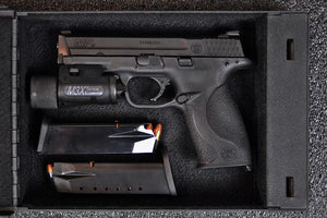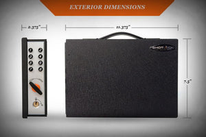 Shotlock Handgun 200M Solo-Vault is made of military-grade 14-gauge steel. Features include a flanged no pry lid, double internal locking hooks, carry handle, protective felt inner liner, with key override and no break lock clutch. Will house up to a full-framed handgun.