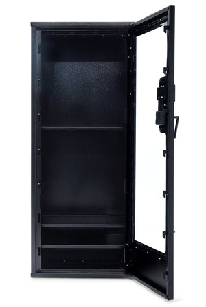 The BlumSafe Secure Display Cabinet combines heavy-duty American-made quality with advanced security features to protect and showcase your watches and valuables. Constructed from durable 14-guage steel, it employs a patent-pending vertical beam with an innovative 8-point locking system that goes beyond traditional mechanisms. The locking carriage, reinforced with eight slots, is positioned on end and fully supported to prevent bending, neutralizing pry attacks with ease. The lock is shielded by a single-layer hardplate, further enhancing the safe's defense against tampering.