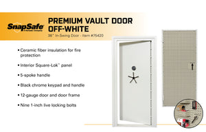 Here are some features of the SnapSafe 75420 Premium Vault Door in white. It features ceramic blanket insulation and is one hour fire-rated up to 2300 degrees F. The backside of this door features SnapSafe's Square-Lok back panel. You can purchase optional accessories to store items right on the door. These include shelves, pistol/rifle racks, baskets, and more.