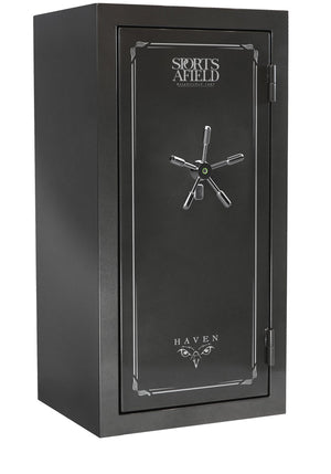 Security features on the Sports Afield SA5930HX Haven Series Gun Safe include a theft alert audio alarm, (10) 1.5" steel bolts, uni weld construction, and a bolt-down kit with 4 anchor bolts to mount to a solid surface. The outside is painted a durable dark earth matte textured finish. Inside there is a door organizer and adjustable shelves that can be customized depending on your needs. This gun safe will hold 36 long guns on the inside and 6 on the door organizer. It weighs a total of 560 pounds and has external dimensions of 59.00" high by 30.00" wide by 25.00" deep. Remember to add 2" to the depth for the handle, lock, and hinges.