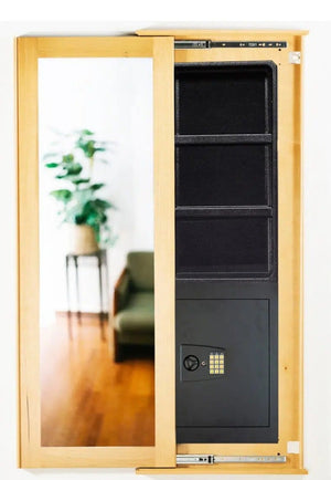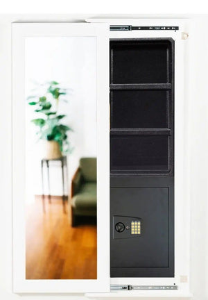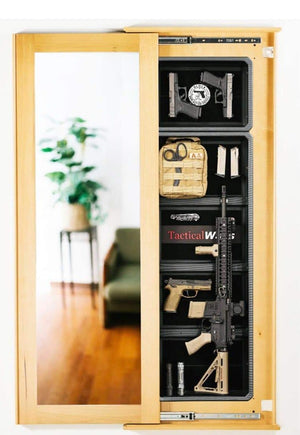 CLICK HERE to watch our video on “What to Do When Your Safe Arrives.”Are you worried about someone breaking into your home and finding your weapons? Why not hide them in plain sight? Tactical Walls 1450M acts as a full-length mirror but provides two hidden compartments to store your rifles and pistols. The smaller compartment for your pistols is 10.00" H x 14.00" W x 3.50" D. The larger of the two compartments will hold your rifles and is 40.00" H x 14.00" W x 3.50" D. This concealment mirror fits between 16" on the center studs.