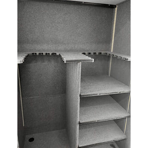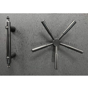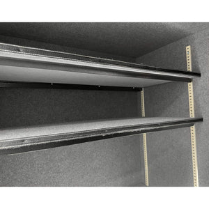 The outside is painted an extremely durable armored black finish that looks great in any location. The handle is a black, 5-spoke handle. The edges are beveled to give it a great look. Inside is a gray fabric interior with leather-line shelves. The interior is customizable by allowing you to move the shelves up or down or remove them altogether. There are two reinforced adjustable top shelves, three adjustable side shelves, and a dual gun rack.