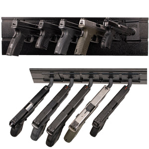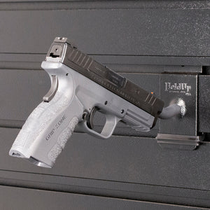 The Hold Up Displays HD52 In-Barrel Wall Mount Pistol Holder is a smart way to store and showcase pistols in tight spaces. Its 30-degree mounting angle creates clear visibility and quick access, making it ideal for high-density pistol walls in gun rooms, vaults, and retail setups. The in-barrel design securely holds handguns without damaging the interior and can be oriented left, right, or front-facing, depending on your layout. Built from steel with a durable black powder-coat finish, the HD52 is made in the USA and is available for either flat-wall or slat-wall mounting. Backed by a lifetime structural warranty, it's a simple, rugged solution for expanding or organizing your display.