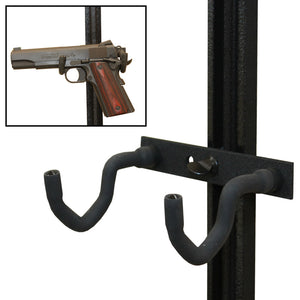 Constructed from sturdy steel and finished with a durable black powder coat, the HD09-TK is built to handle daily use in gun rooms, retail environments, and display walls. The padded cradles protect firearm finishes while providing a stable resting point for both semi-automatic pistols and revolvers. The pivoting frame and cradles allow you to set each item at virtually any angle, making it easy to customize your display for visibility, spacing, or aesthetic preference.