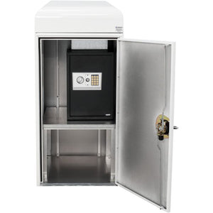 Security is paramount with built-in theft deterrent features, including constructed depository openings and chutes that thwart removal attempts by thieves. Interlocking seams resist prying attacks, while a 3-point locking system secures the top, bottom, and opening sides of the unit. A keyed paddle lock with a weather-sealed cover prevents freezing and keeps dirt out. This model features a two cubic-foot safe inside with a simple-to-operate electronic lock. Each unit comes with two override keys and is programmable to have many different combinations. Your deposits are secured behind two doors.