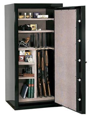 The AMSEC RF6528 is among the top-rated gun safes in production today in terms of burglary protection. It has a high-density concrete fill between its inner and outer steel walls, and it's massive 5-3/4" thick door is protected by a standard combination lock and 10 steel 1-1/2" locking bolts. The safe weighs in at more than 3400 pounds, so you can be sure that burglars would have a very hard time removing it from your home. All of the safe's security features add up to a TL-30 burglary rating from Underwriters Laboratory, the same rating given to many safes used by jewelers in their retail operations.