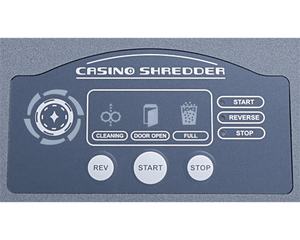 The solid-steel cutting blades and heavy-duty motor can shred entire decks of playing cards, multiple dice, casino chips, and gaming tokens. It's as simple as pressing start on the LED Control Panel and load the items to be shred onto the conveyor. All the material is fed into the shredder and safely destroyed, preventing theft and fraud. The shredded pieces fall into the plastic waste bin which can hold up to 28 gallons.