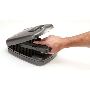 Having quick access to your handgun, especially in an emergency is important. Consider the Hornady Rapid Safe 2600KP L RFID 98177. It has several ways to get inside quickly. One is using the RFID watchband, key fob, or sticker. Just touch one of those items to the safe and it will instantly open with the spring-assist lid. Up to five RFID tags can be programmed.