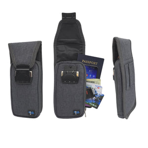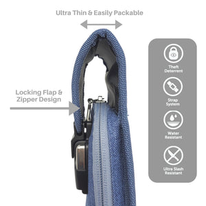 The material of the Portable Safe is slash-resistant, water-resistant, and features RFID blocking capabilities. The lock can be reprogrammed to any 3 digit combination. It is lightweight and easily packable. Plus it can be secured to your belt. There are two color options available - Heather Blue or Heather Gray.