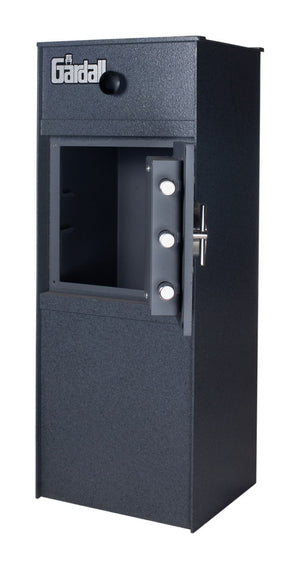 The Gardall RC1237SD Single Door Depository Safe is made from solid steel and has 1/4" of steel in the body of the safe, and 1/2" of solid steel in the door. This makes it a very secure depository safe. When the rotary hopper is ready to accept deposits, only the top portion is open. The employee puts the cash deposit into the rotary drum and turns the handle. It falls into the safe compartment which is secured by a UL Listed Group II Dial Combination Lock. A digital electronic lock is available as an upgrade for an additional cost. Just in case, there is also an anti-fishing baffle to prevent anyone from fishing the cash deposits back out through the hopper.