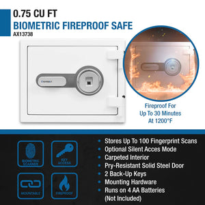 To protect your items from theft, the Barska AX13738 Biometric Fireproof Safe White has two solid steel long locking bar bolts that prevent someone from trying to pry open the door. The safe can be bolted down using the pre-drilled mounting holes. This is highly recommended. The outside uses a biometric lock that can store up to 100 users. This means you can program multiple fingerprints and even store those of a trusted relative or friend. The lock operates on 4 AA batteries, which are not included.