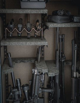 Cantilevered modular shelving - Quickly and easily adjust the shelving to meet the individual storage needs. Barrel racks can be adjusted at various heights to accommodate long guns, as well as shorter carbine models. The cantilevered design eliminates the need for a vertical shelf support to add extra interior space.