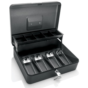 Honeywell's 6213 all steel tiered cash box is the perfect solution for your cash management needs. There is a 5-compartment tiered coin tray which allows for larger storage capacity when the tray is lifted. There is also 4 bill compartments with clips for organization of your cash. The outside is locked by a key lock with 2 entry keys included. The outside is painted a scratch-resistant powder coat finish for a lifetime of use. A convenient carry handle will allow you to easily carry around if needed. Honeywell includes a 1 year limited warranty with the 6213.