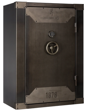 Browning has designed the look of the 1878-49 to feel retro. The paint is a stained metal finish and includes an 1878 metal plate graphic. There is also a cast-iron wheel to open and close the safe. Inside features a beige fabric color.