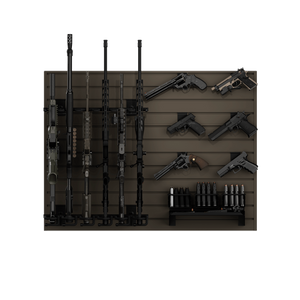 • Supported by our heavy-duty aluminum slatwall, our camo system securely holds all your firearms and is built to last.