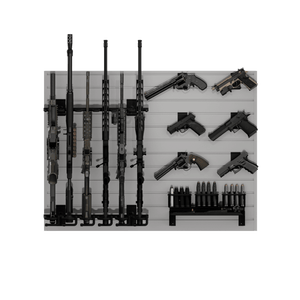 This bundle is designed to hold up to six long guns, six pistols, and twelve magazines, with the included heavy-duty steel shelf providing space for ammo, optics, or additional gear. As your collection grows, you can seamlessly add additional panels and accessories.