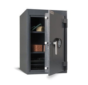 The AMSEC 30" High "B" Rate Security Container has a 1/2" thick solid steel door that is recessed to resist pry attacks. The door jamb construction has maximized protection against pry attacks by its body being formed of high-tensile steel. There is also a U.L. listed Group II key changeable combination lock with over 1 million possible combinations. Optional electronic locks are also available.