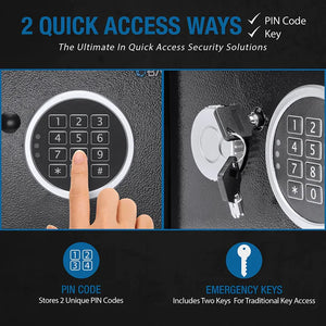 Equipped with two pin codes, two solid steel locking bolts, and a sturdy steel body construction, the Barska AX13942 ensures reliable protection. Easily bolt it to a solid surface using the predrilled mounting holes and included hardware for added security. Inside, a protective floor mat protects your valuables from scratches.