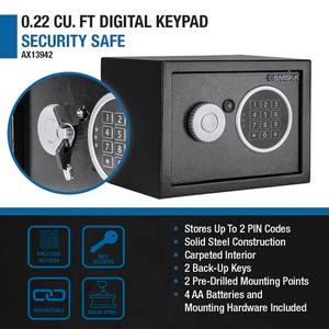 The Barska AX13942 Digital Keypad Security Safe is a compact yet robust solution for your dorm room, office, or closet needs. With outside dimensions of 6.70" in height, 9.10" in width, and 6.70" in depth, this safe maximizes security without occupying a large space.