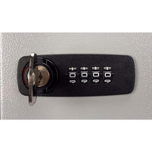 The outside of the Barska CB13602 160 Keys Lock Box with Combination Lock is secured by a 4 number combination lock and key lock. Each box comes with 2 lockbox keys. The key cabinet has 4 holes in the back to secure to a solid surface so that someone doesn't remove it from the premises where they have time to break into it later. The outside dimensions are 22.00" high by 15.00" wide by 3.00" deep. It weighs 12.80 pounds without the keys inside. The body and door are constructed of 1/32" solid steel (0.8mm) and it is finished in grey.