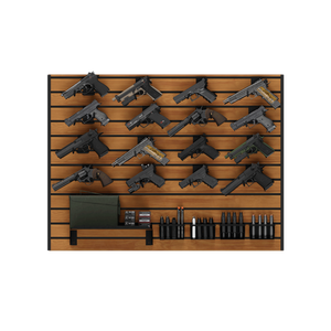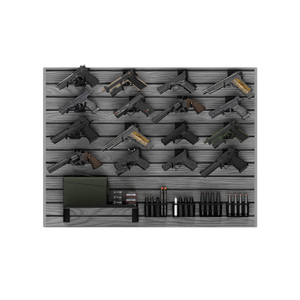This bundle features 16 multi-angle, rubberized pistol display hooks that securely hold any pistol or revolver. Also included are four magazine racks, each capable of holding four double-stack magazines, and a heavy-duty display shelf with a 50lb capacity. All of these accessories mount to Hold Up Displays high-quality extruded aluminum slatwall panels, providing a flexible and durable setup.