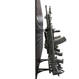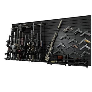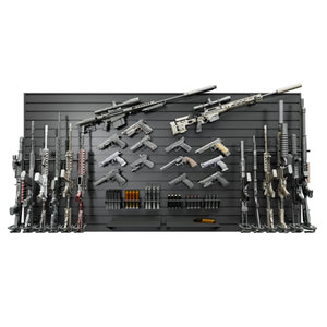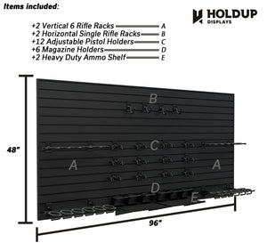 CLICK HERE to watch our video on “What to Do When Your Safe Arrives.”The HD107 Tactical Wall Display Package from Hold Up Displays is the ultimate gun room organization tool. Proudly made in the USA by gun enthusiasts, for gun enthusiasts, This package can hold up to 14 rifles and 12 handguns, along with a variety of other accessories such as ammo, magazines, optics and more. Keep your collection out of the way without keeping it out of sight or out of mind.