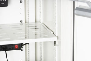 • Includes two heavy-duty perforated shelves, each adjustable and capable of holding up to 220 pounds.