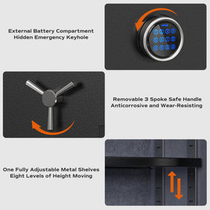 Installation is a breeze with the pre-drilled anchor holes and included hardware for floor mounting. The exterior battery compartment is easily accessible, making battery replacement convenient if needed. Additionally, the safe supports a silent mode setting for discreet operation. This model has a high capacity with outside dimensions of 19.68" tall by 14.17" wide by 13.78" deep and 1.29 interior cubic storage space.